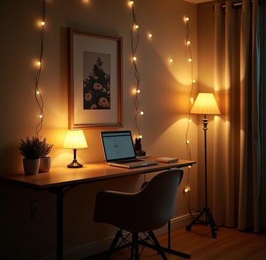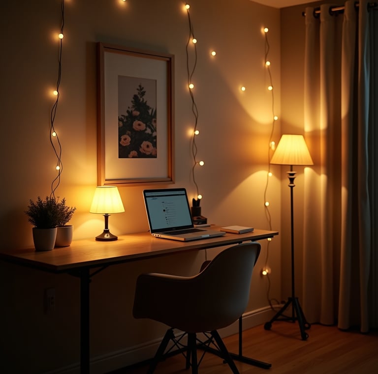 Harsh overhead lighting can make your workspace feel cold and uninviting. Instead, go for warm, layered lighting.