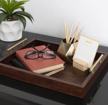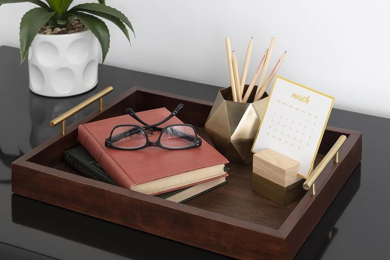 A wooden tray instantly defines the space and prevents clutter from looking messy. It creates a visual boundary, making even everyday items feel intentional and styled rather than scattered.