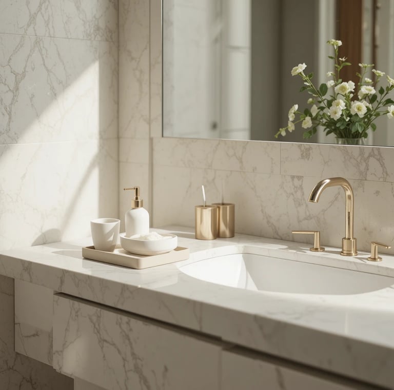 Mirrors aren’t just functional — they double visual space. Pair them with soft lighting to create a bright, open feel (perfect for bathroom inspo looks).